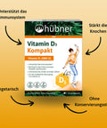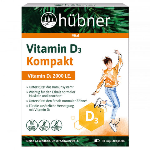 Vitamin D3 ist eine fettlösliche Verbindung, die in den hübner® Vitamin D3 Kompakt Kapseln in Olivenöl gelöst wird. Die Flüssigkeit wird von einer Kapsel umschlossen, was den Verzehr vereinfacht.
